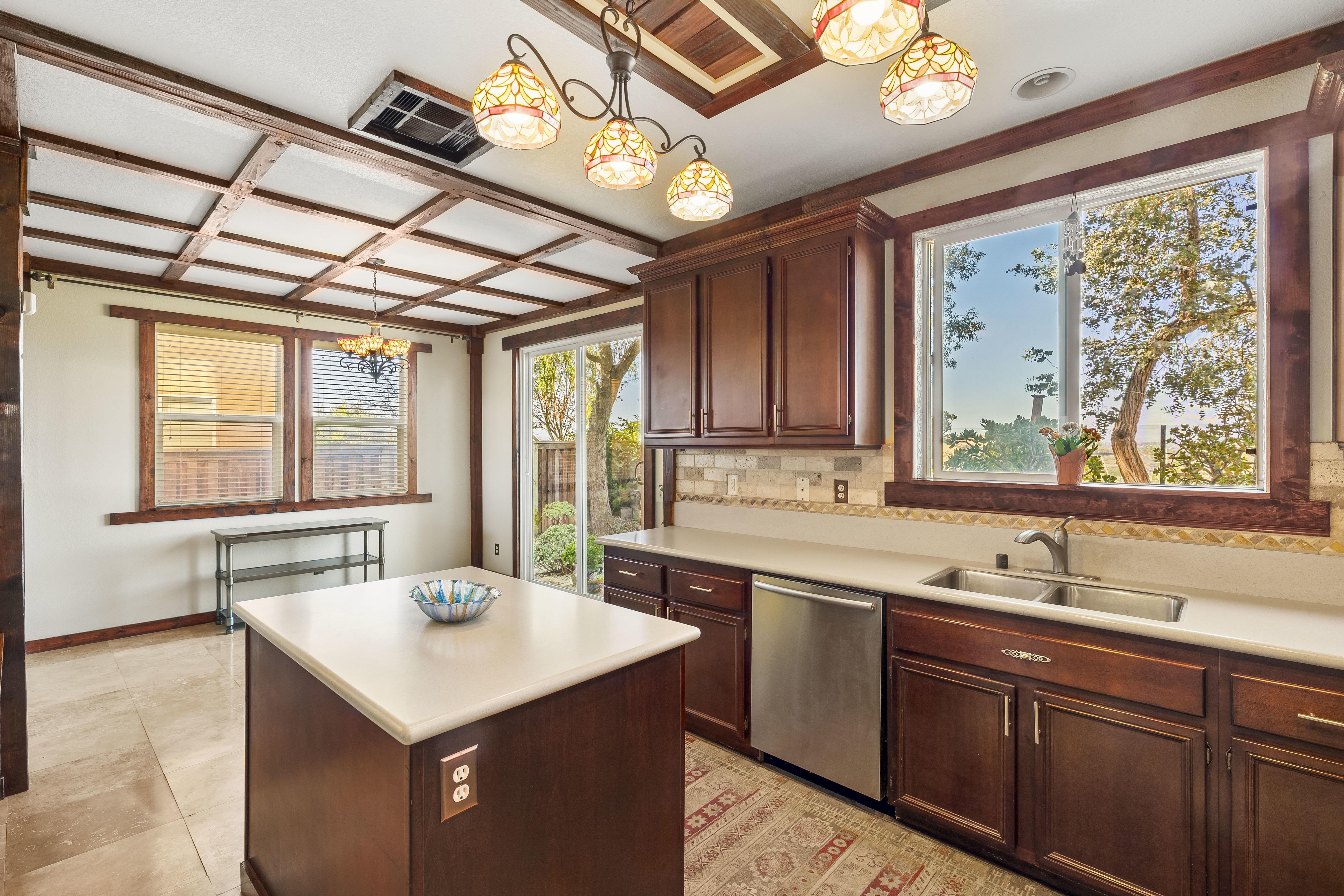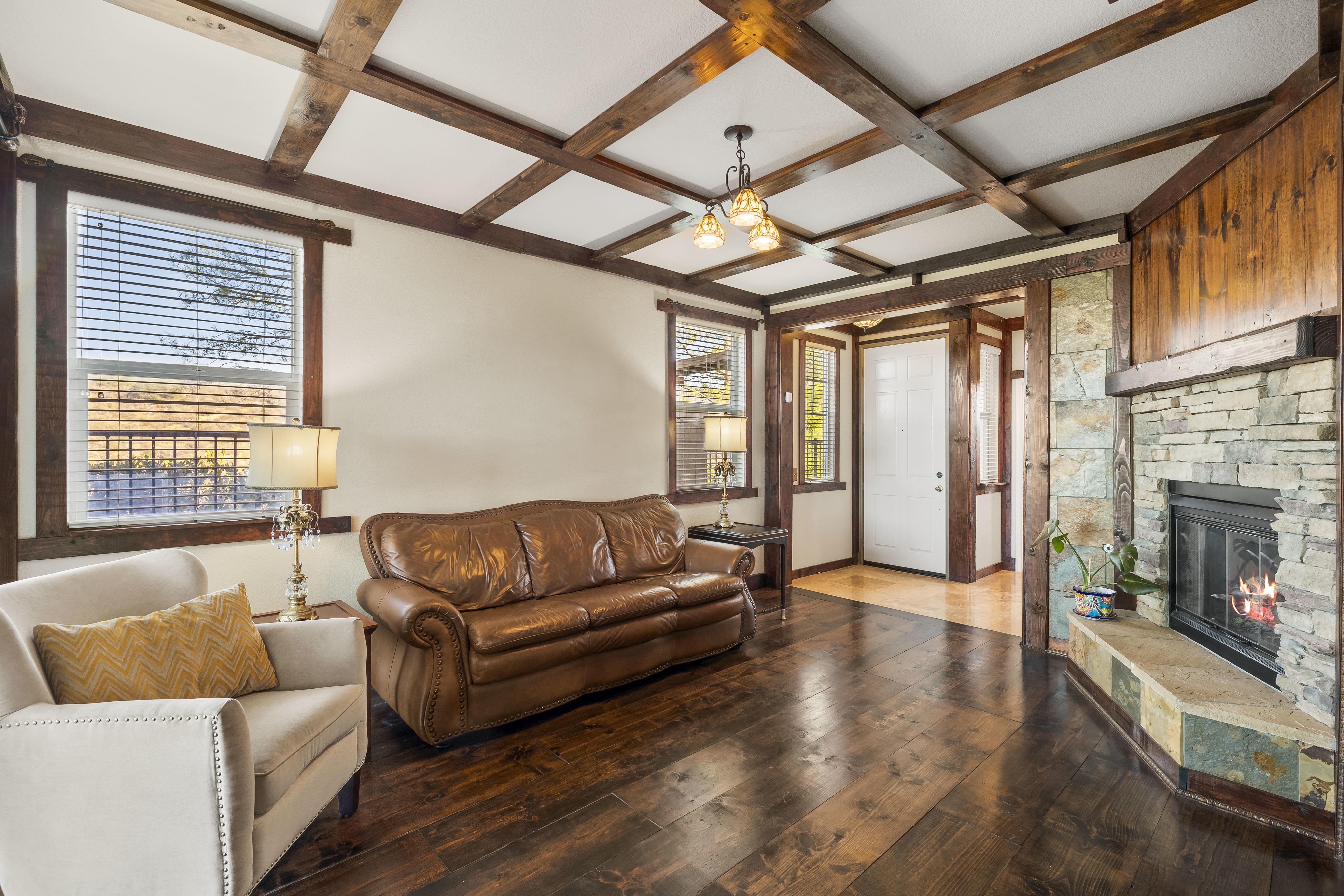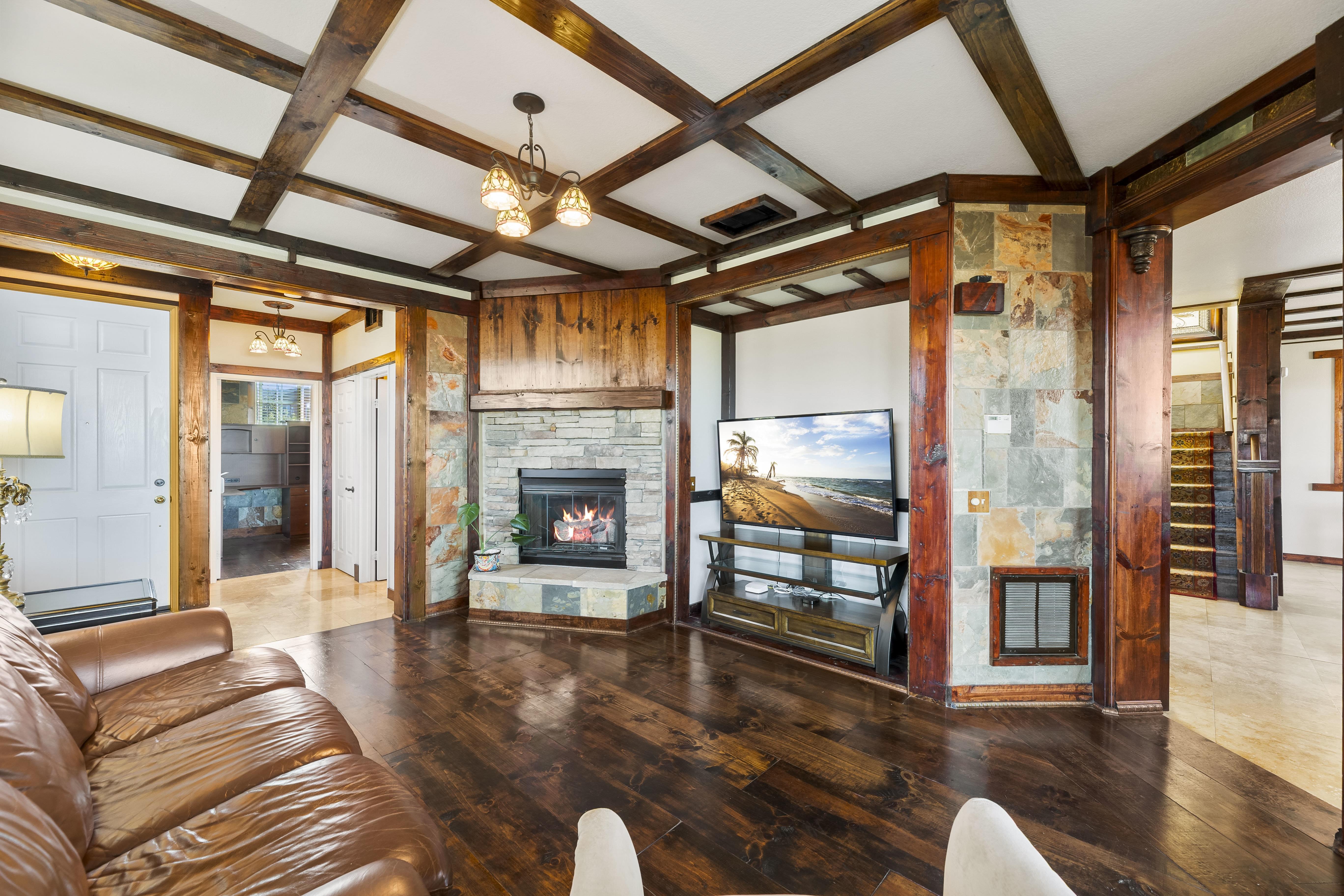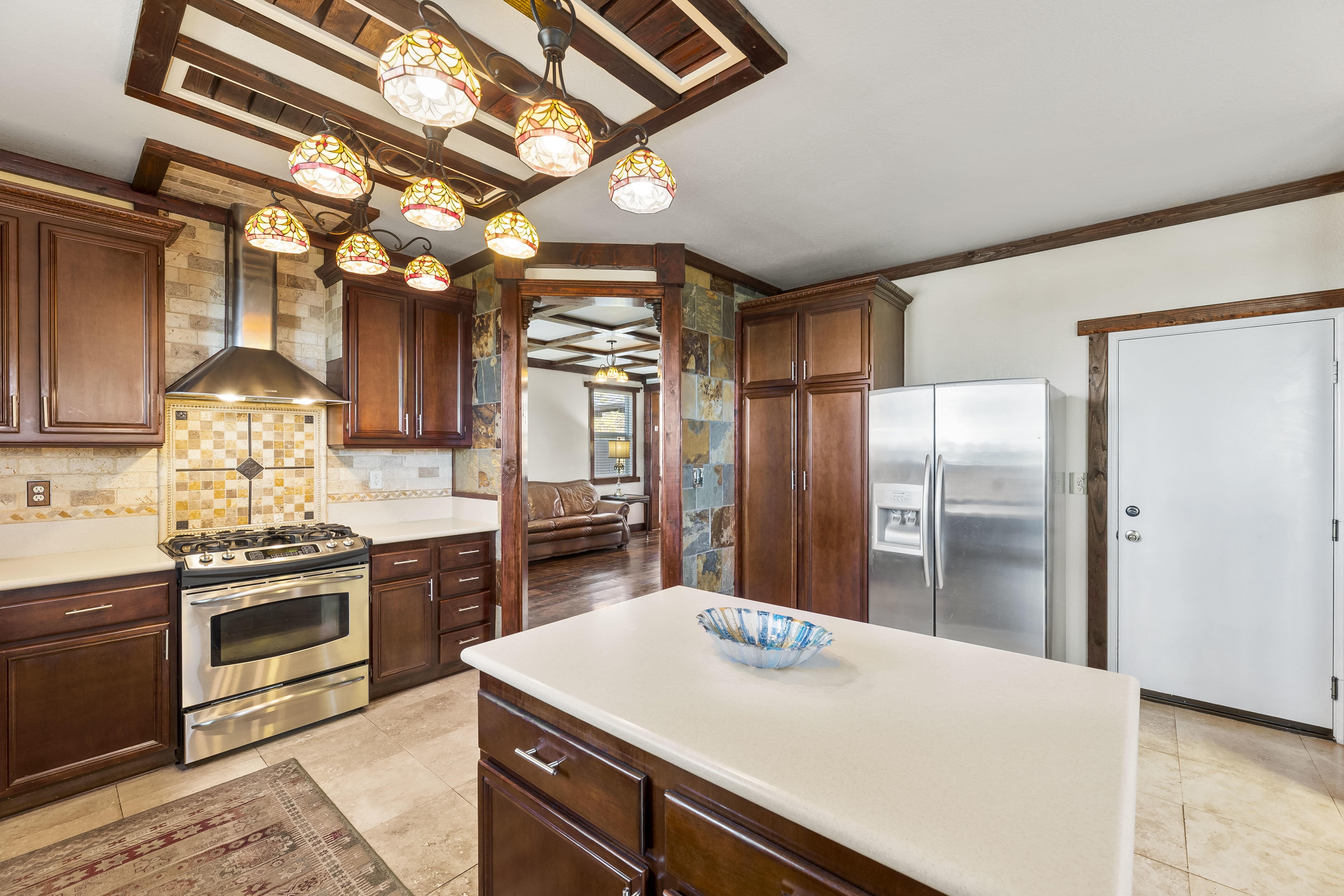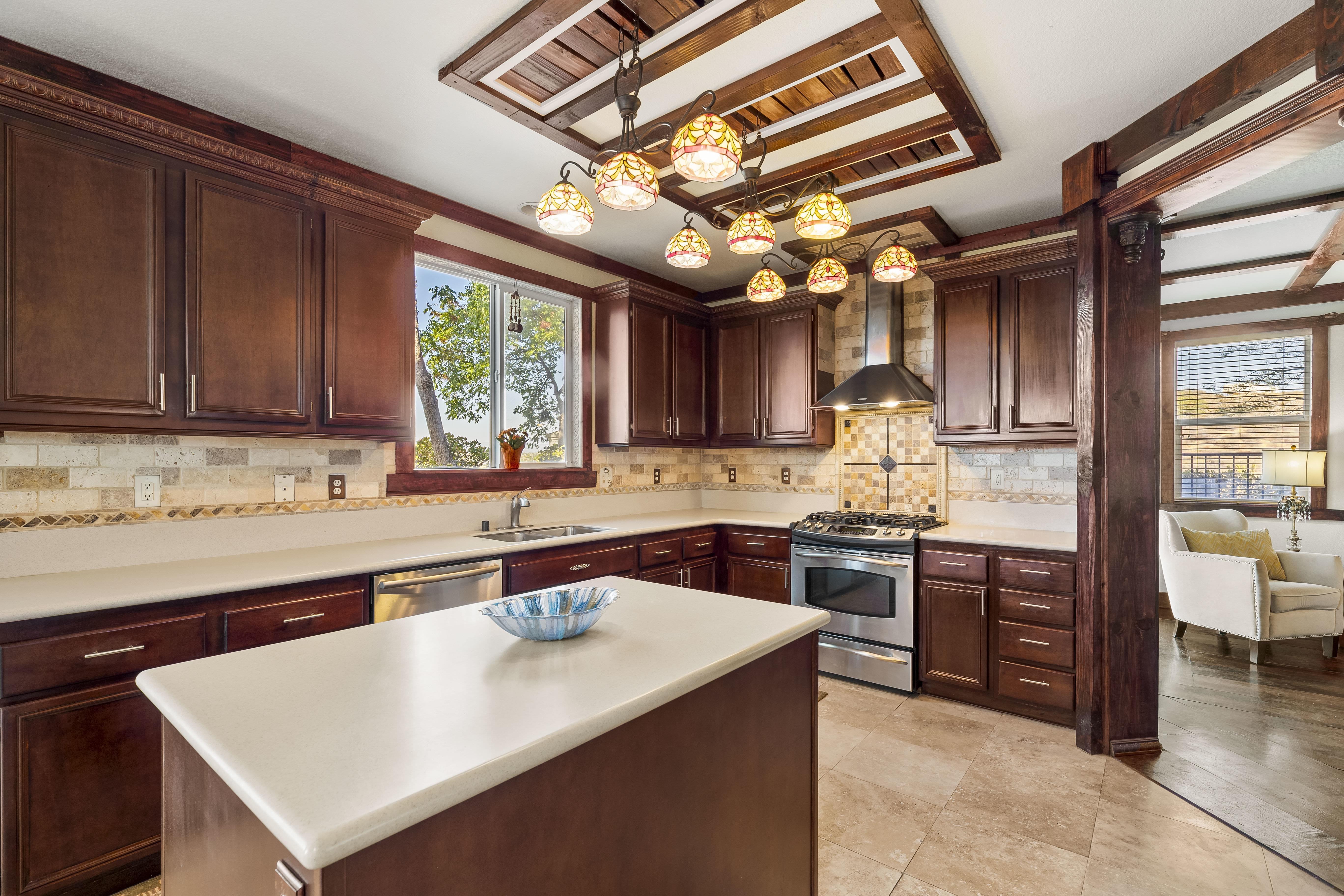 The main floor’s open design unfolds like a gallery, each space telling its own story. The living room commands attention with its hand-stacked stone fireplace — a tactile centerpiece crowned with a solid wood mantle and framed by tray ceilings and custom trim that speak to artisan craftsmanship rarely seen today. The kitchen is a chef’s retreat, blending Corian countertops, intricate tile backsplash, and a thoughtfully positioned window that captures natural light like a spotlight on art.