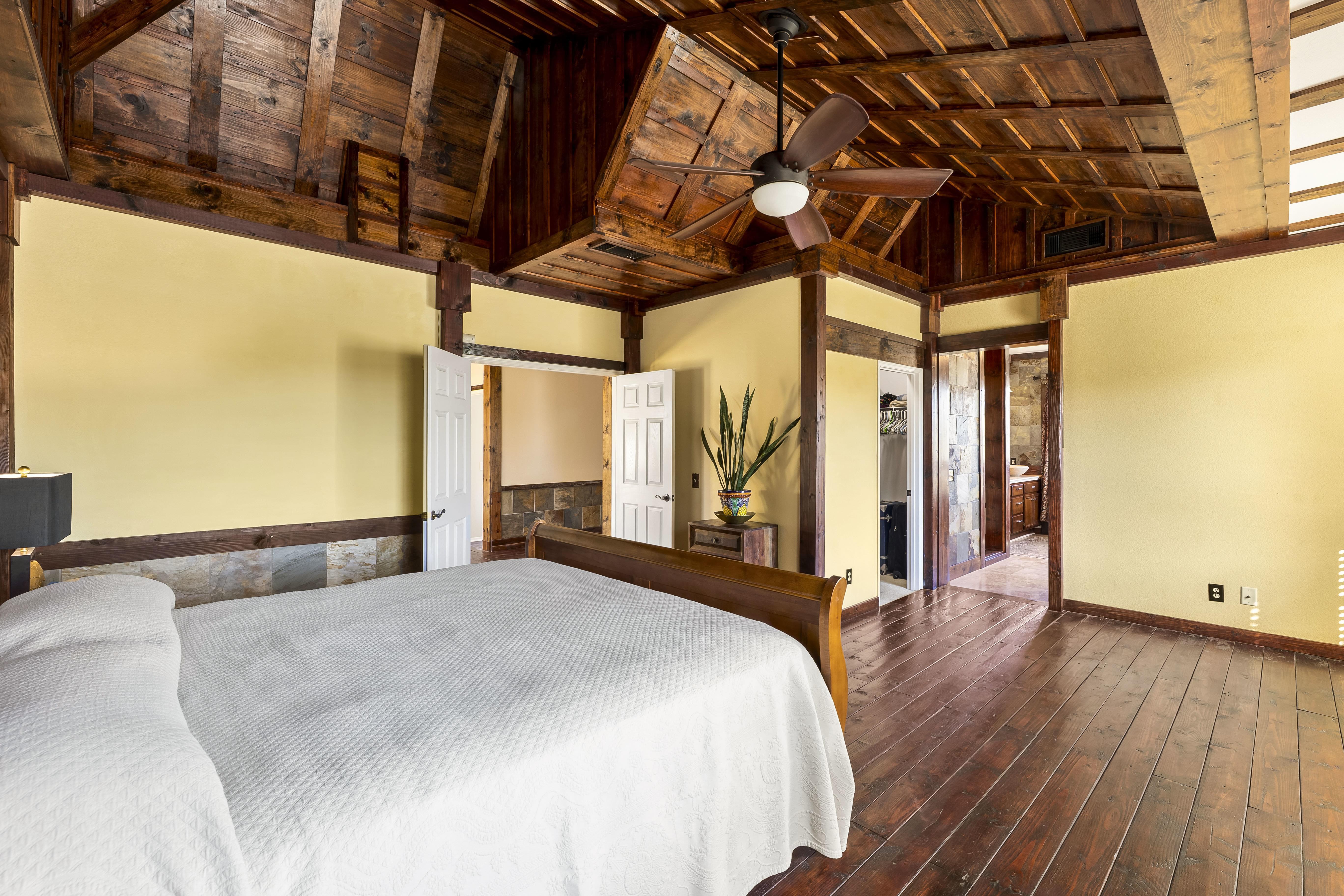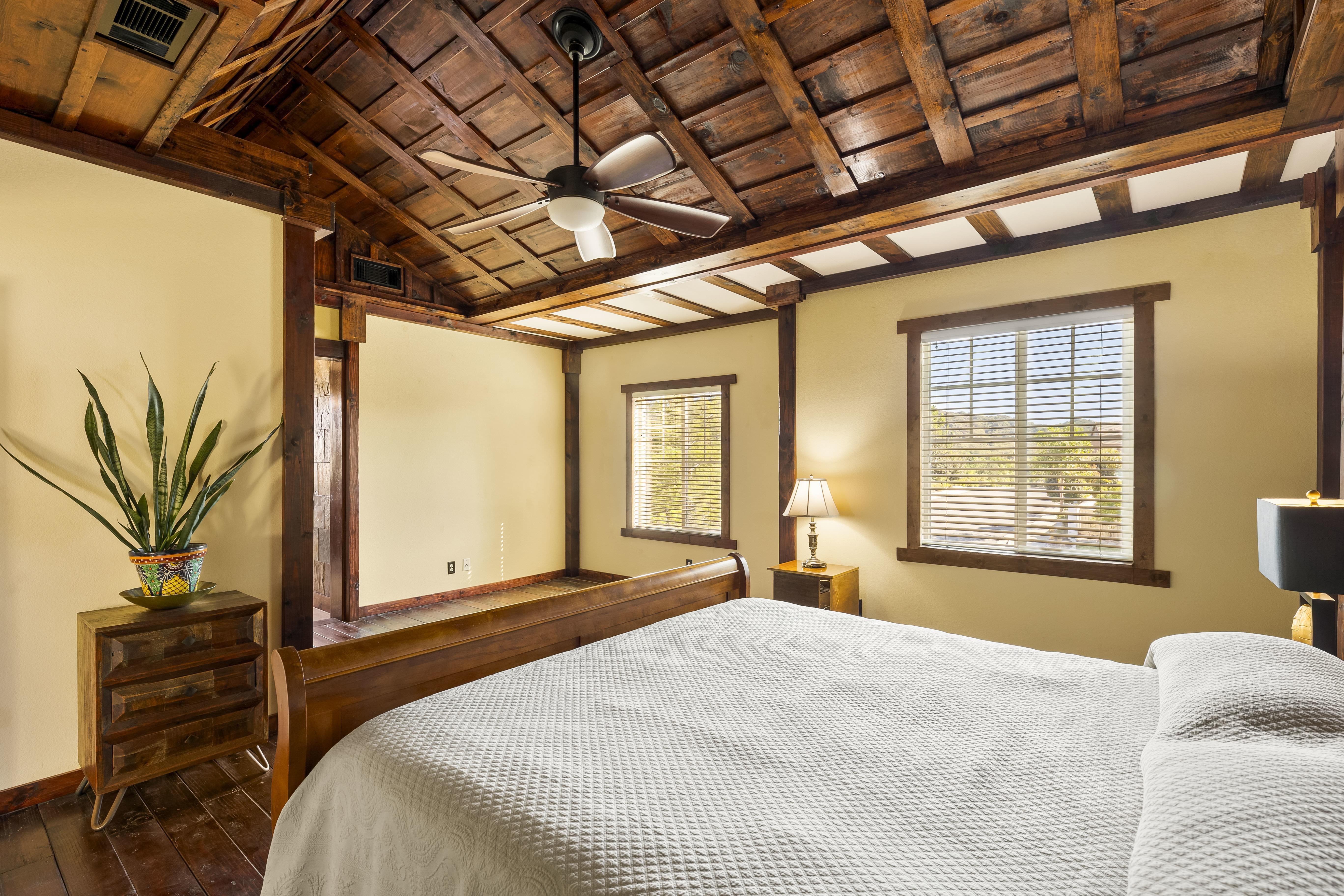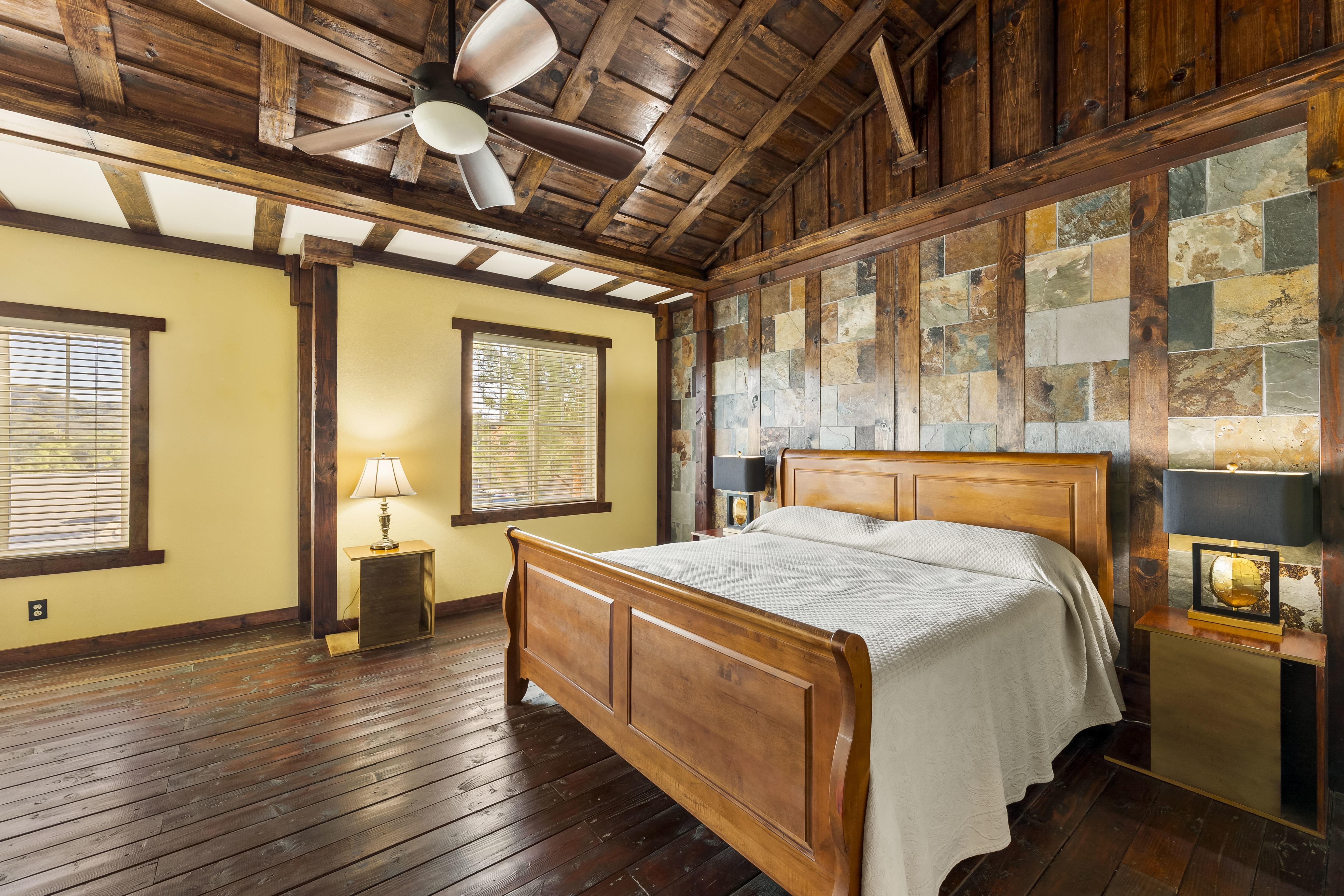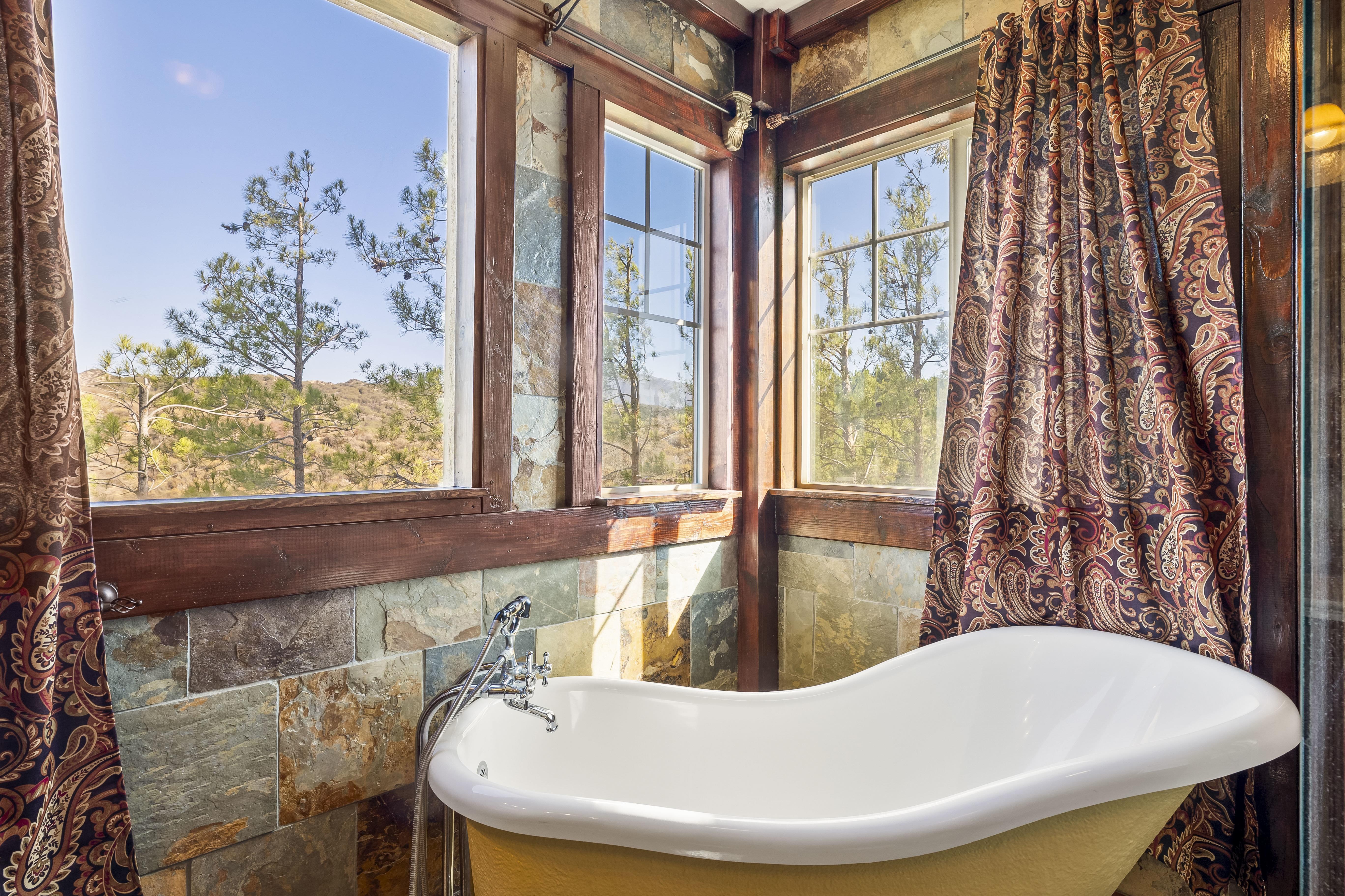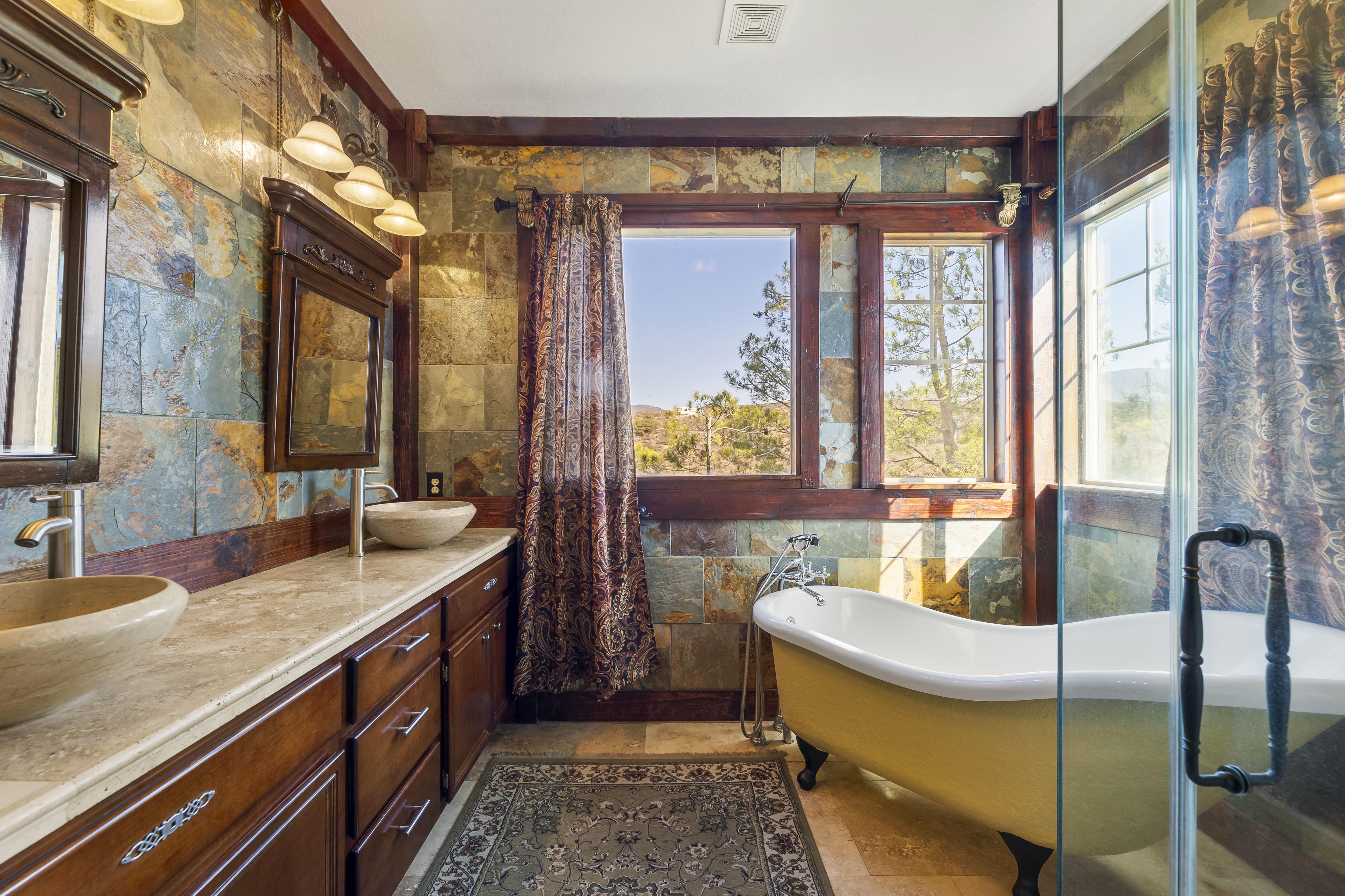 The primary suite is nothing short of a private resort— a grand space defined by double doors, a hand-tiled feature wall, soaring wood-lined vaulted ceilings, and an intimate sitting area. The en-suite bath is a spa-worthy experience in itself, with a clawfoot soaking tub, walk-in steam shower wrapped in custom tile, and dual vanities that evoke timeless sophistication. French doors from the secondary bedrooms open onto a private balcony, where sweeping hill and valley views stretch endlessly into the wine country — a living landscape painting that transforms with the day’s light.