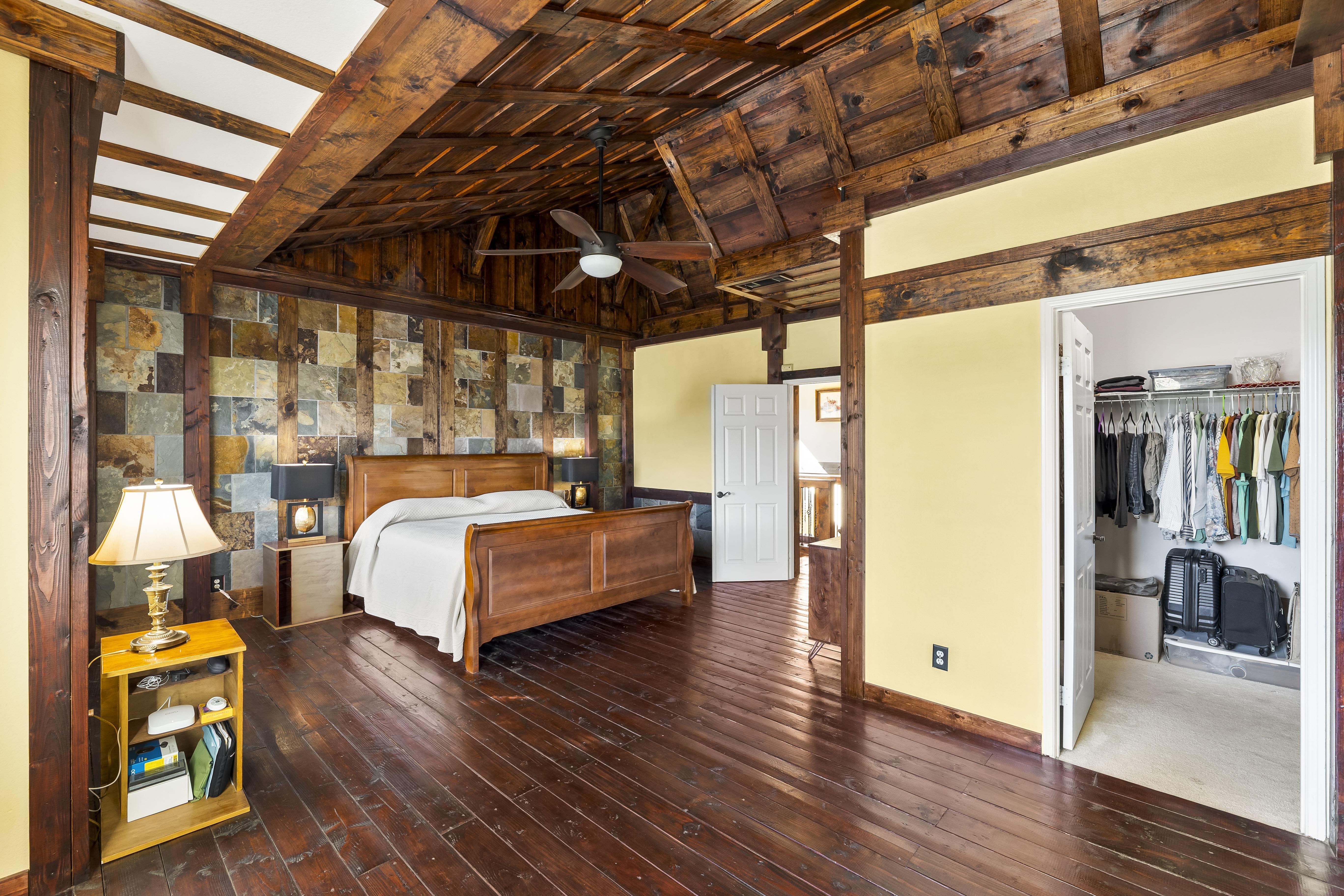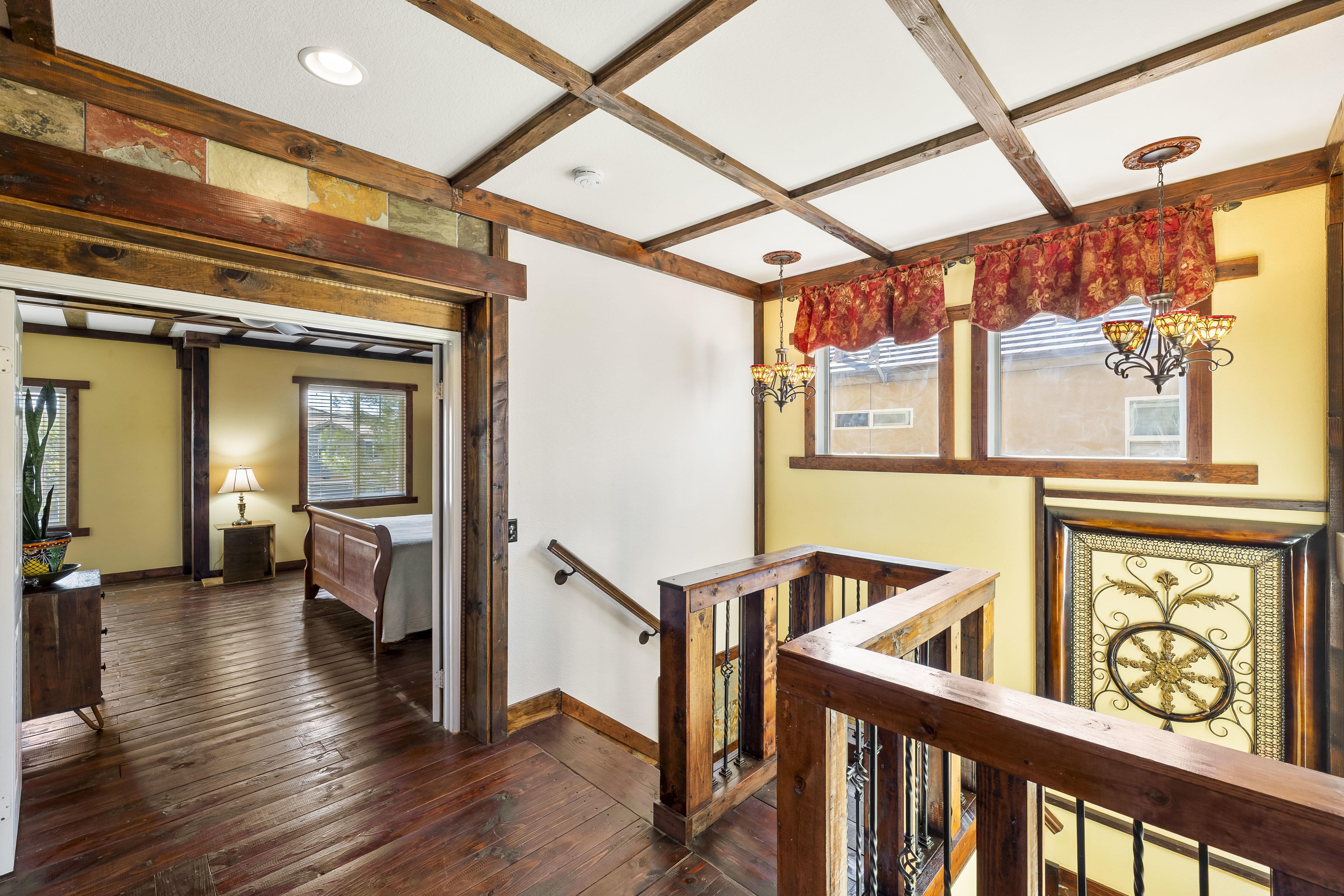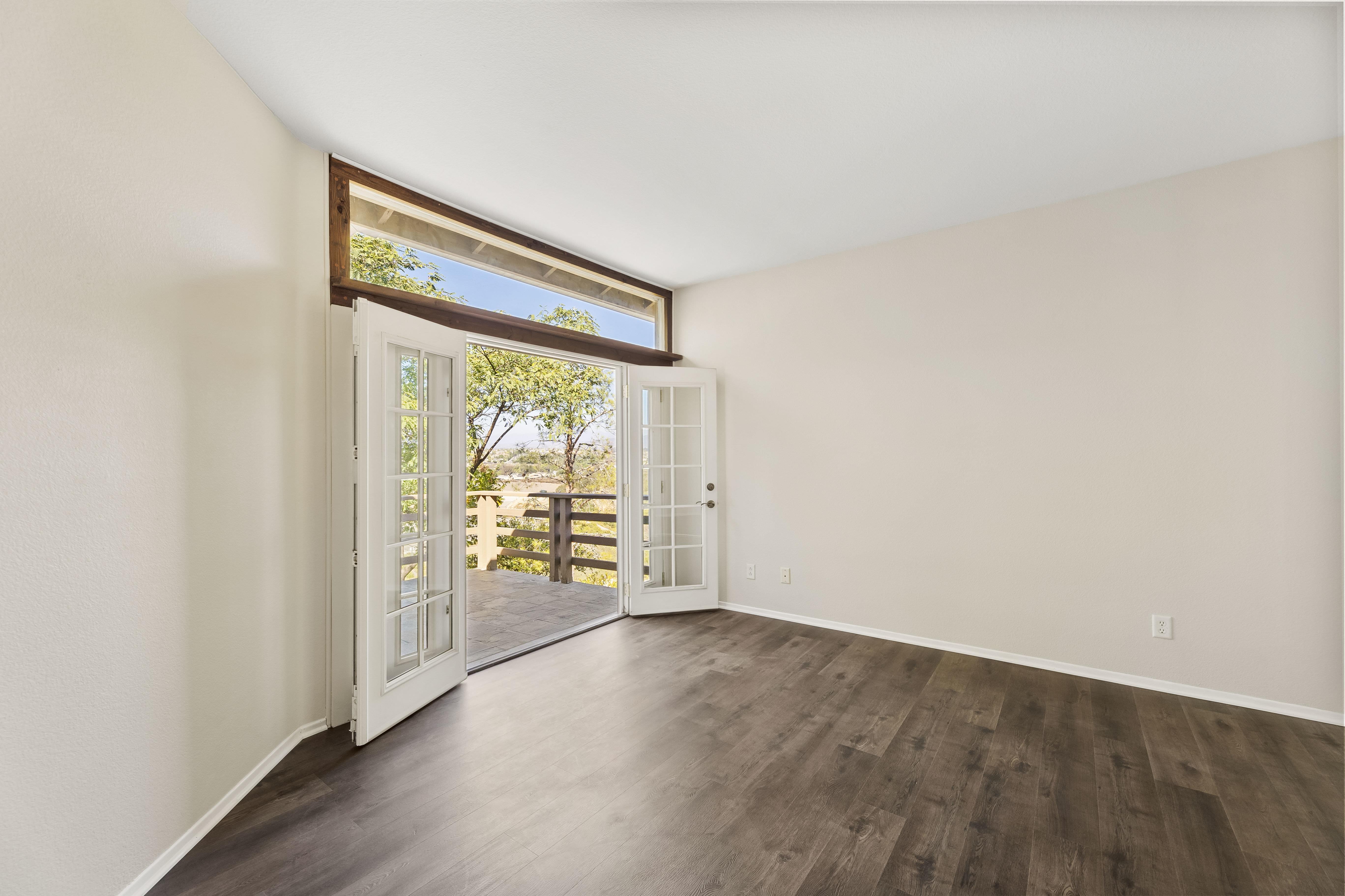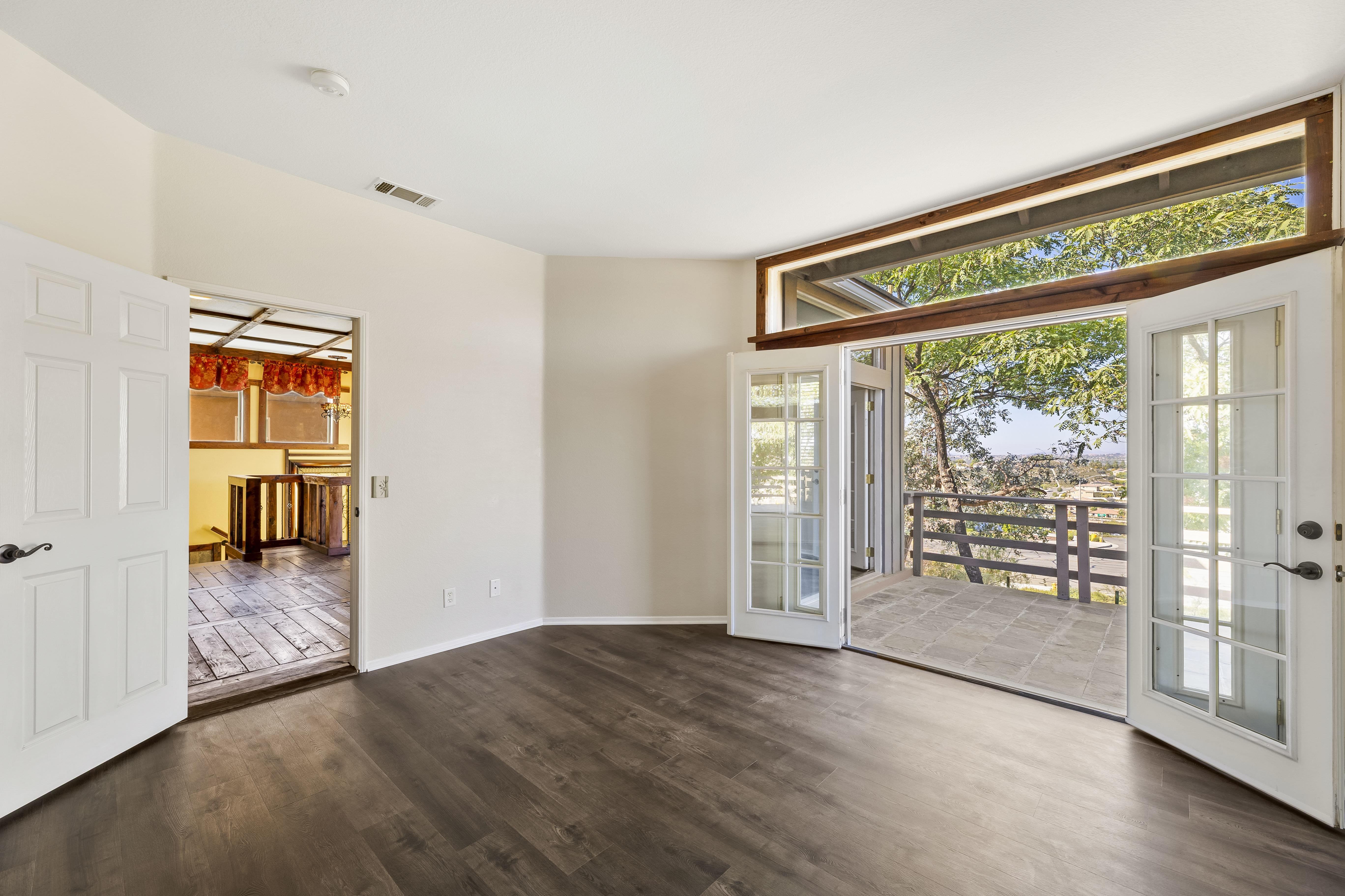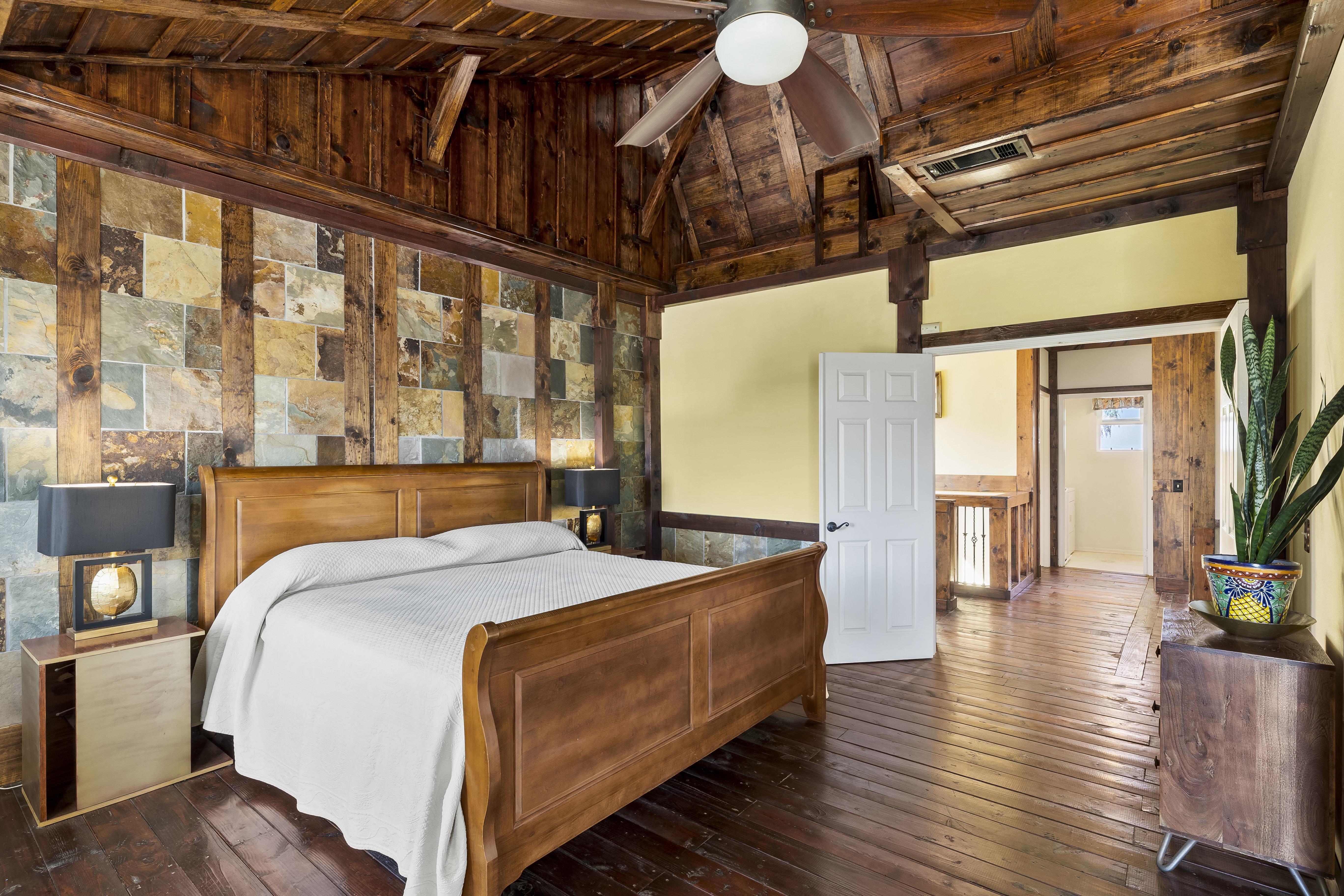 The primary suite is nothing short of a private resort— a grand space defined by double doors, a hand-tiled feature wall, soaring wood-lined vaulted ceilings, and an intimate sitting area. The en-suite bath is a spa-worthy experience in itself, with a clawfoot soaking tub, walk-in steam shower wrapped in custom tile, and dual vanities that evoke timeless sophistication. French doors from the secondary bedrooms open onto a private balcony, where sweeping hill and valley views stretch endlessly into the wine country — a living landscape painting that transforms with the day’s light.